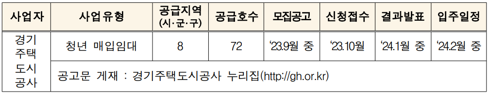분기별 입주자 모집 물량은 매입 시장 상황, 퇴거 세대수 등에 따라 유적적이며 정확한 모집 물량은 매 분기 발표 됩니다. 참고로 청년·신혼부부 외 일반, 고령자 등은 수시 모집 중입니다.